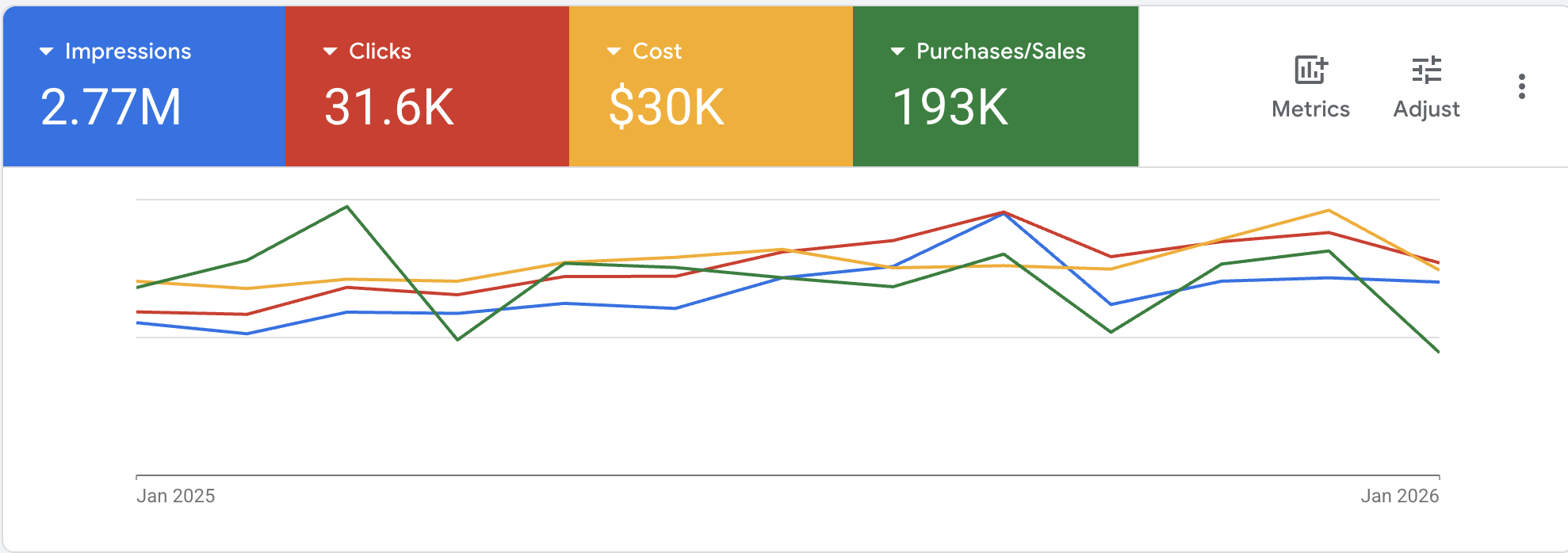 Across Google and Meta combined, paid media generated $177,631+ in revenue on $31,460 in ad spend, delivering a blended ROAS of 5.65x. Google Ads alone produced $158,069.61 in purchase value with a 5.75 ROAS, while Meta campaigns added incremental growth and strong efficiency during key promotional periods.
